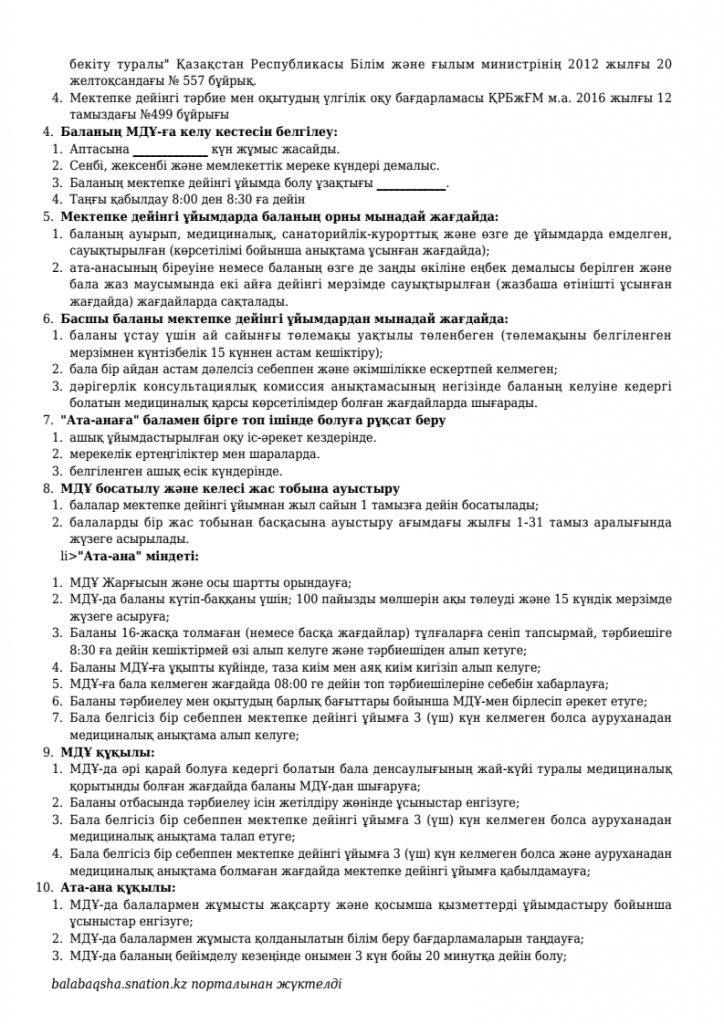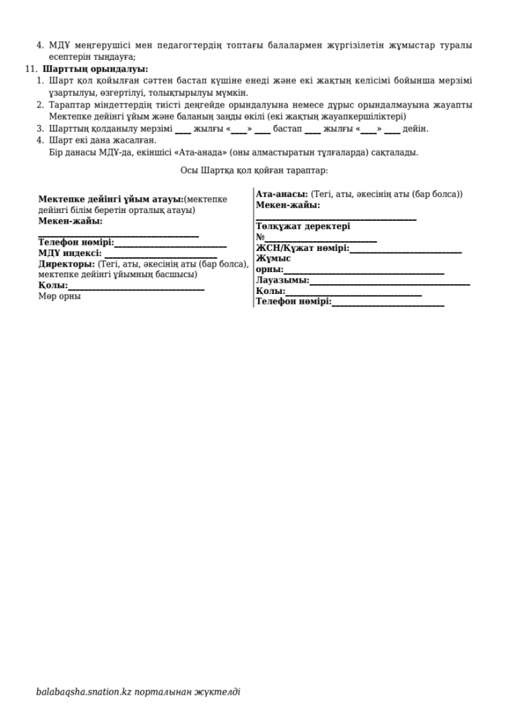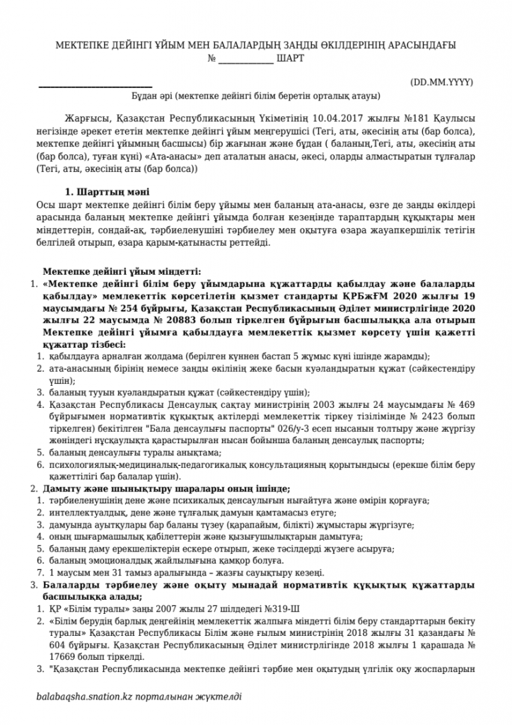 МД Ұйым мен балалардың заңды өкілдеріннің арасындағы шарт